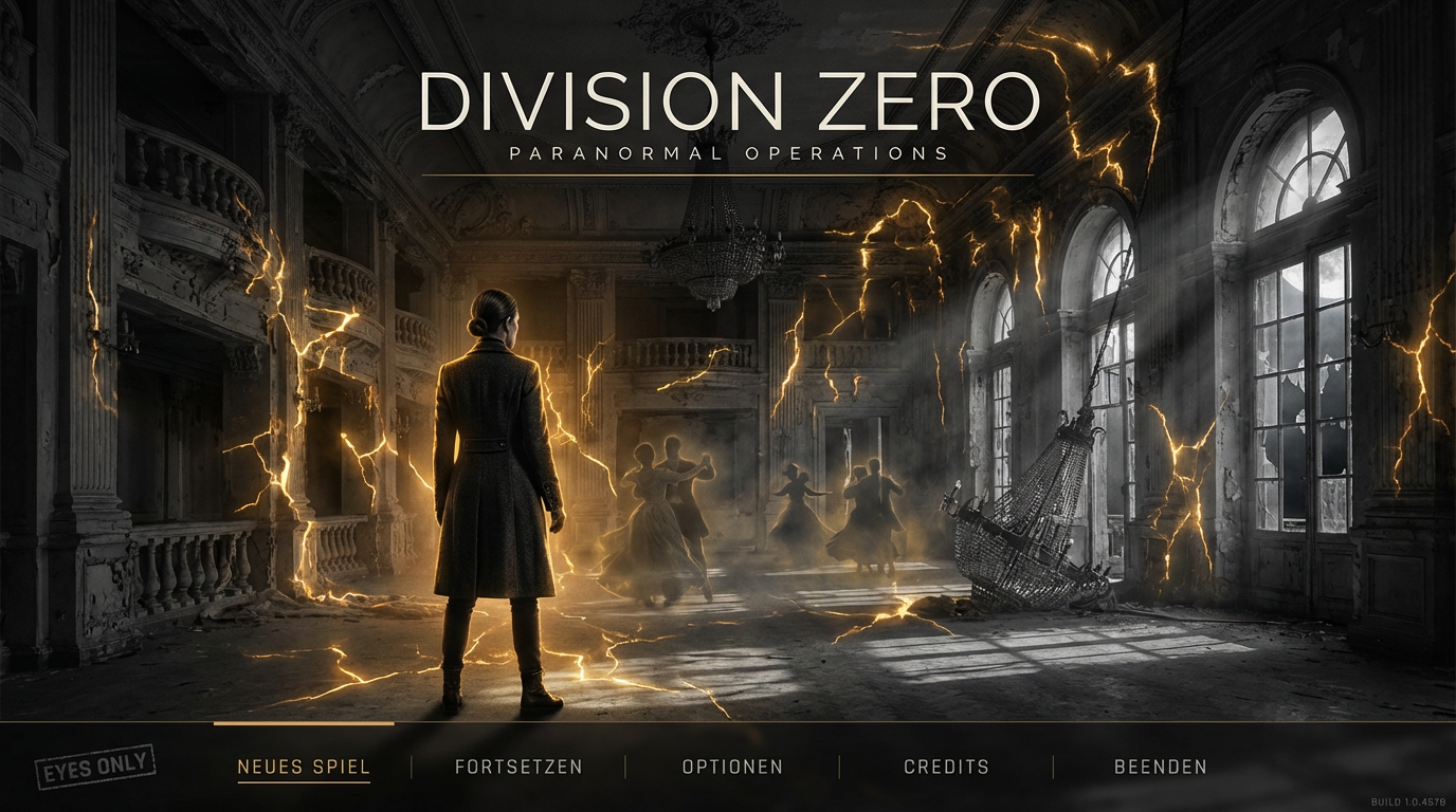 Konzept B: Cinematic-Fullscreen im verfallenden Ballsaal – Mara Voss, Amber-Blitze, horizontale Menüleiste.