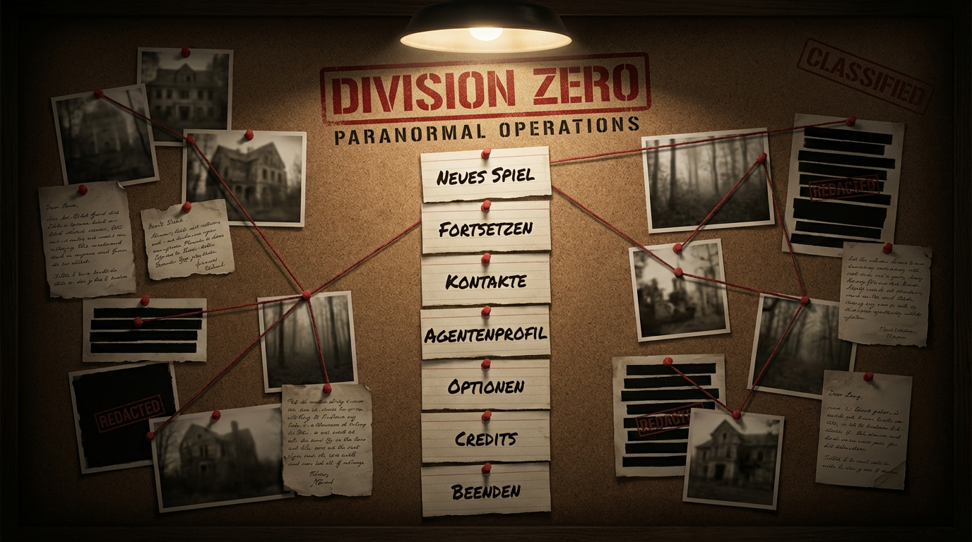 Konzept D: Korkbrett-Interface mit roten Nadeln, Tatortfotos, REDACTED-Stempeln.