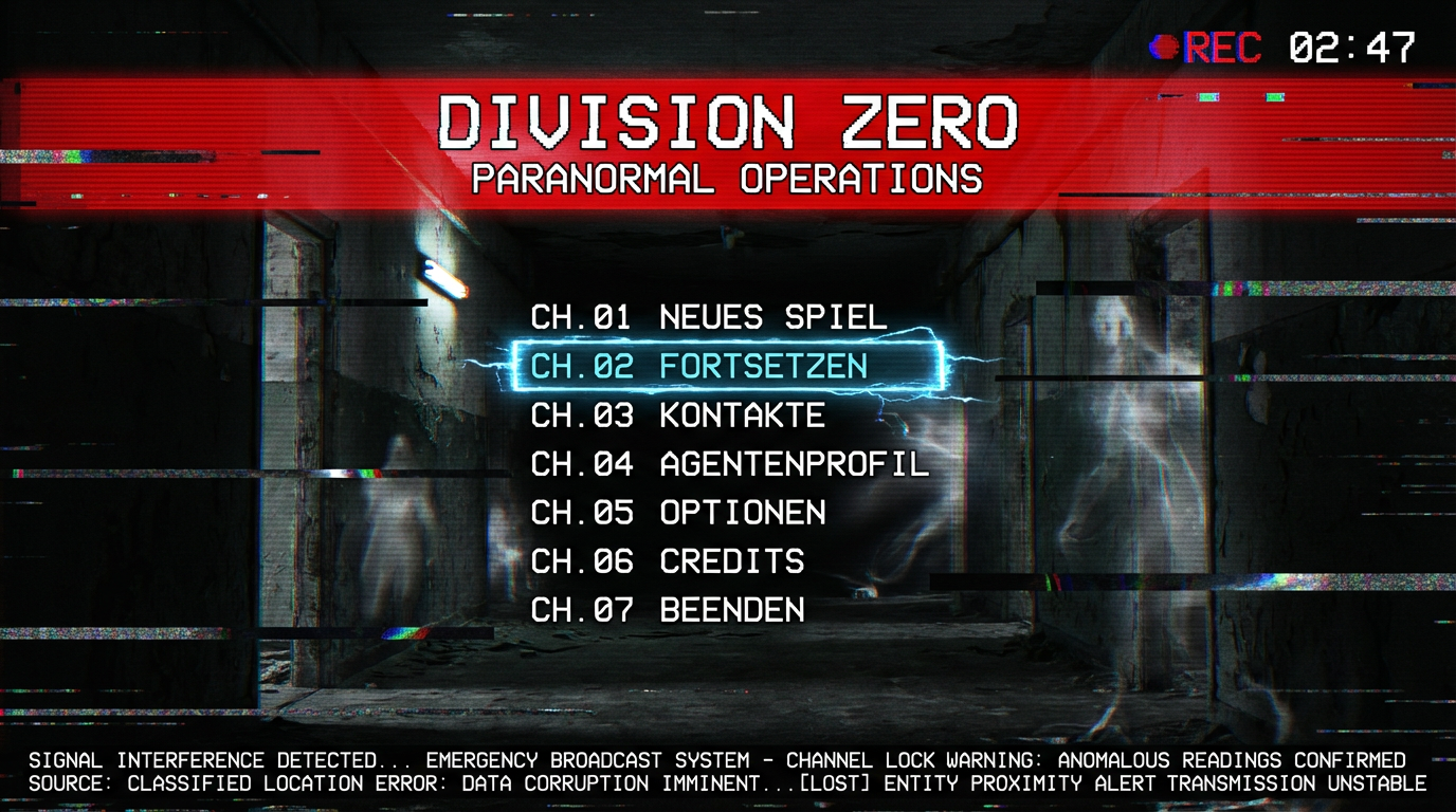 Konzept F: VHS-Notfallübertragung mit Glitch-Animationen und Alarmfarben.