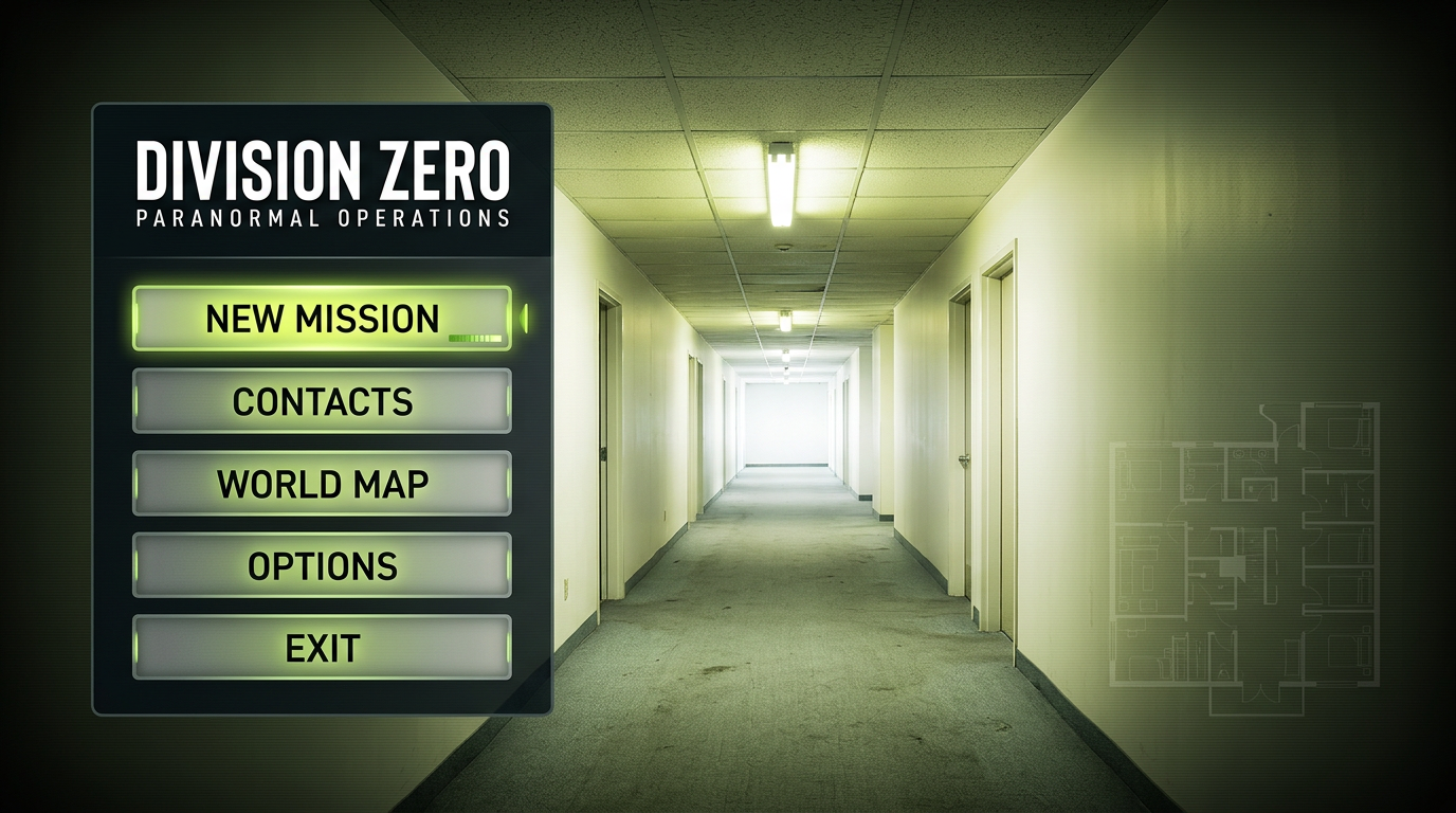 Konzept I: Liminal Horror – verlassener Büroflur um 3 Uhr nachts, fluoreszierendes Lime.
