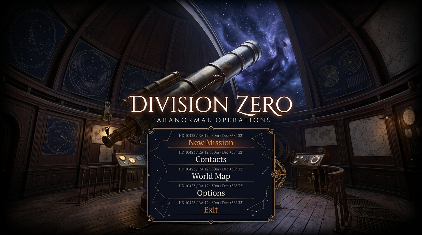 Konzept J: Cosmic Horror – viktorianische Observatoriumskuppel mit Stellar-Katalog-Interface.