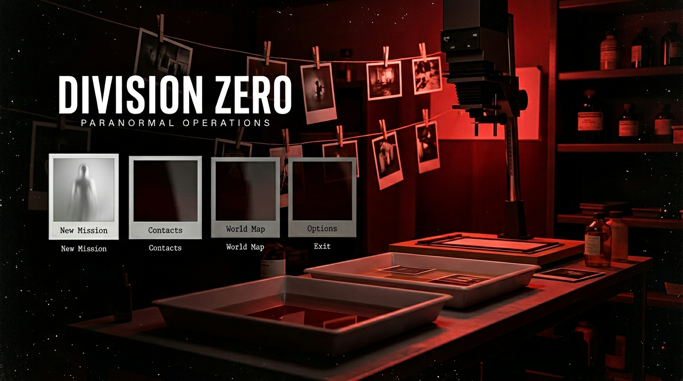 Konzept K: Paranormale Dunkelkammer – Beweis-Fotos entwickeln sich auf Hover aus der Tiefe.