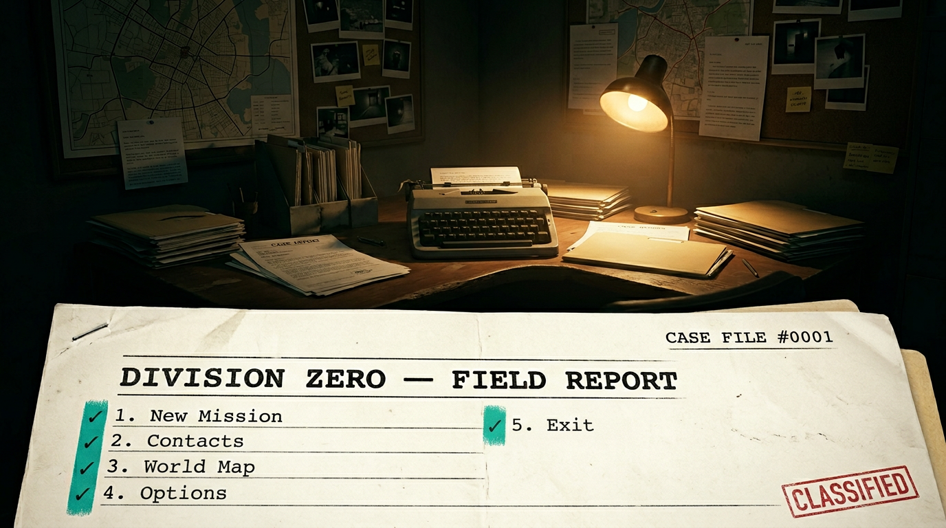 Konzept L: Getippter Feldbericht auf Creme-Papier – Typewriter-Monospace, Teal-Häkchen, Noir-Feldstation.