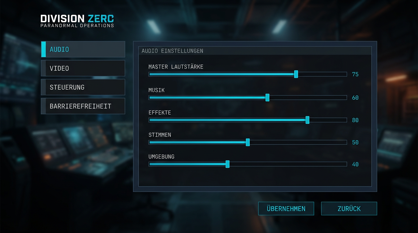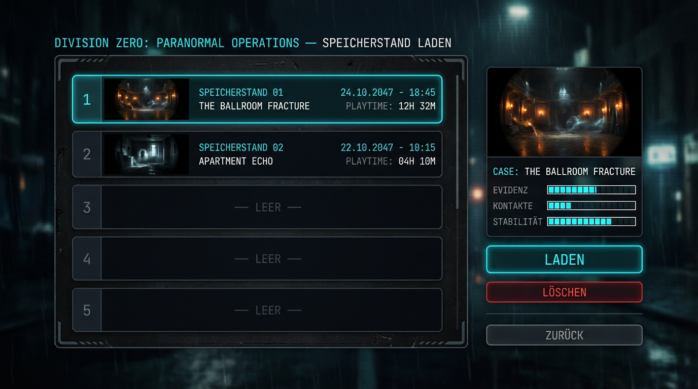 Zwölf vollständige Menü-Konzepte, entwickelt als visuelle Exploration der Designsprache von Division Zero. Jedes Konzept hat einen eigenen Charakter – von taktisch-militärisch bis okkult-rituell.